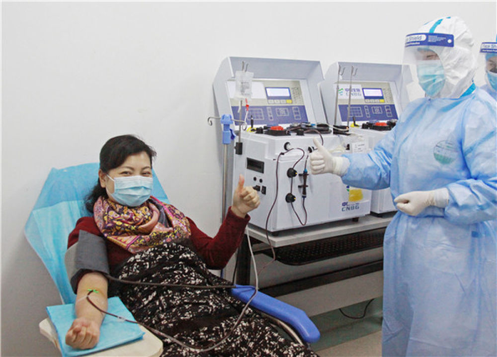 程琳在武汉市金银潭医院捐献血浆(2月18日摄)。新华社发(武汉市金银潭医院供图)
