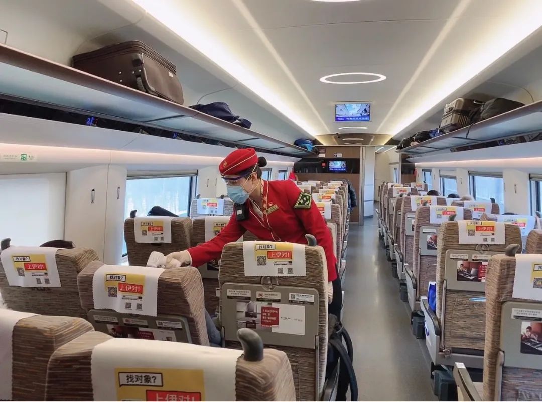 孔维爽:疫情期间,铁路部门实行隔座分散售票,不发售无座票,并预留一定数量的隔离席位。我们车厢也是这样安排的。目前,客流量不是很大,本次列车上座率在50%左右。