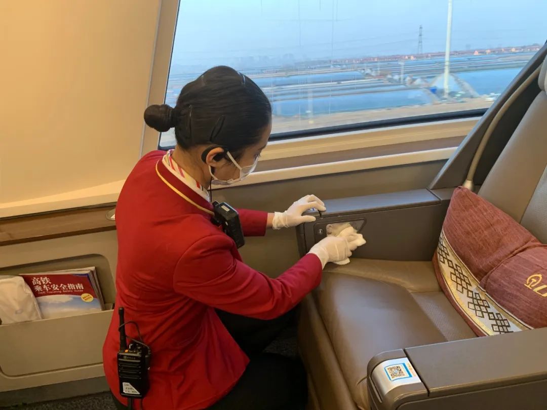 孔维爽:高铁列车出库前,铁路防疫部门对全车内进行常规消毒,库内保洁人员负责对座椅扶手、小桌板、卫生间马桶、卫生间门把手、卫生间冲水按钮、卫生间门锁销、风挡隔离端门开关按钮、商务车座椅调节按钮等重点部位进行擦拭消毒。