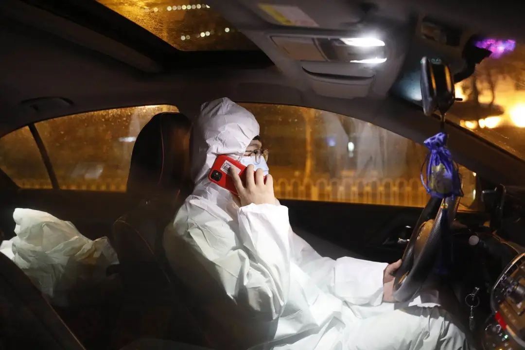 大部分时间,王永朋都呆在自己的私家车里,穿着防护服,戴着手套和口罩,接人或者送人。