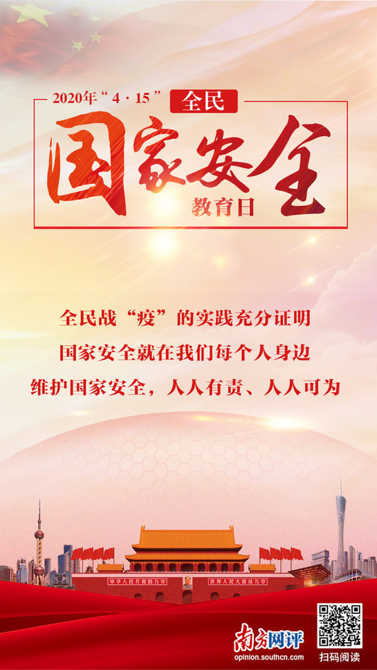 全民的“获得感”来自于“国家安全”。获得感是提升幸福感和安全感的基础。以全民国家安全教育日为契机,把维护国家安全这件“头等大事”抓实抓细抓落地,创新开展国家安全宣传教育,涵养全民的国家安全意识,切实筑牢国家安全的群众基础,凝聚万众一心的强大合力,积极防范、有效化解各类安全风险,就能促进全社会同心共筑国家安全的“命运共同体”,全面提高人民群众的幸福感、安全感、获得感,始终把维护国家安全的战略主动权紧紧掌握在我们的手中。(南方网林伟)