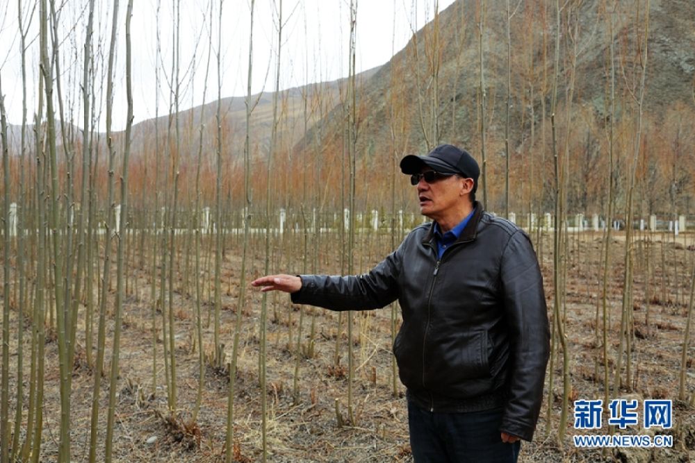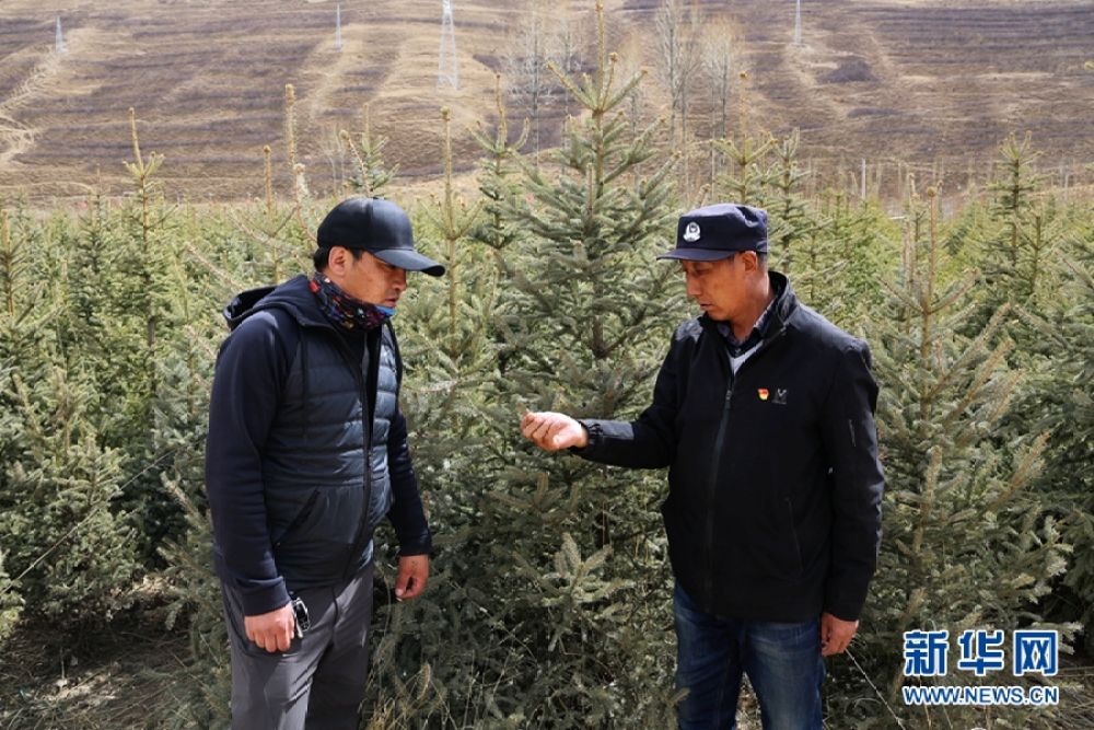 公保旦增(右)与扎巴江才正在查看树木长势情况。新华网 卡娅梅朵摄