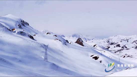 电网铁塔像一条银色的巨龙在雪域高原上蜿蜒起伏。