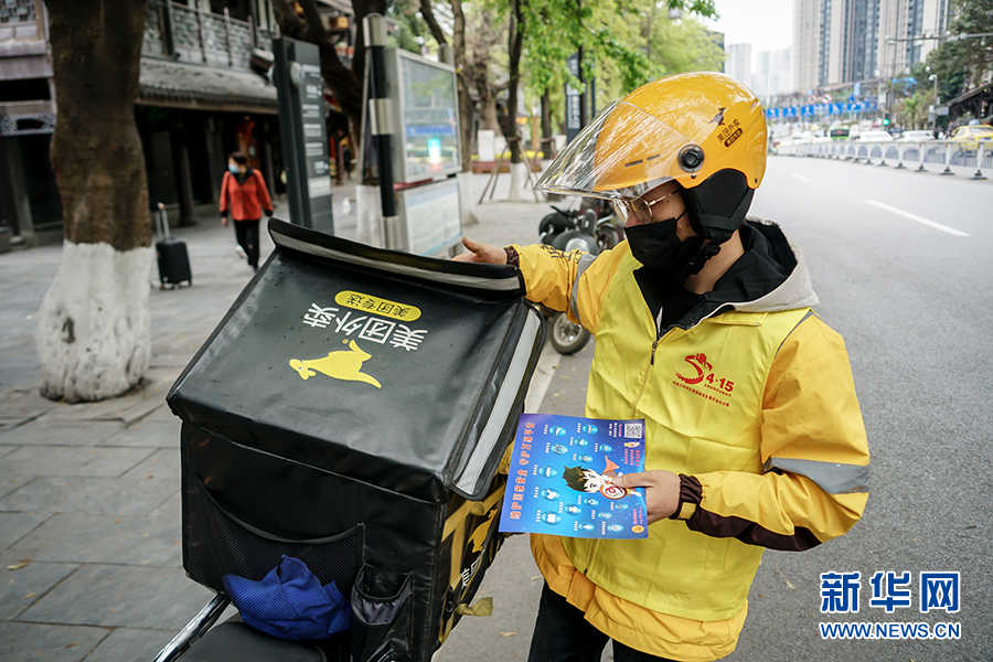 送完这一单后,王淞又赶往下一个取餐点,他希望把更多的宣传制品送出去。王淞表示,在维护国家安全上,人人有责,作为一名外卖小哥的责任,就是通过他们的传递,让更多的人了解国家安全相关知识。新华网 韩梦霖 摄
