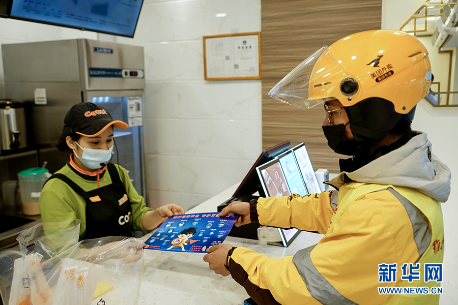 王淞在取餐前,先将一份宣传海报交给了配餐的商家。这是他今天的第9个订单,王淞觉得参加这样的活动十分有意义,让自己在送餐挣钱之外又多了一份社会责任感。新华网 韩梦霖 摄