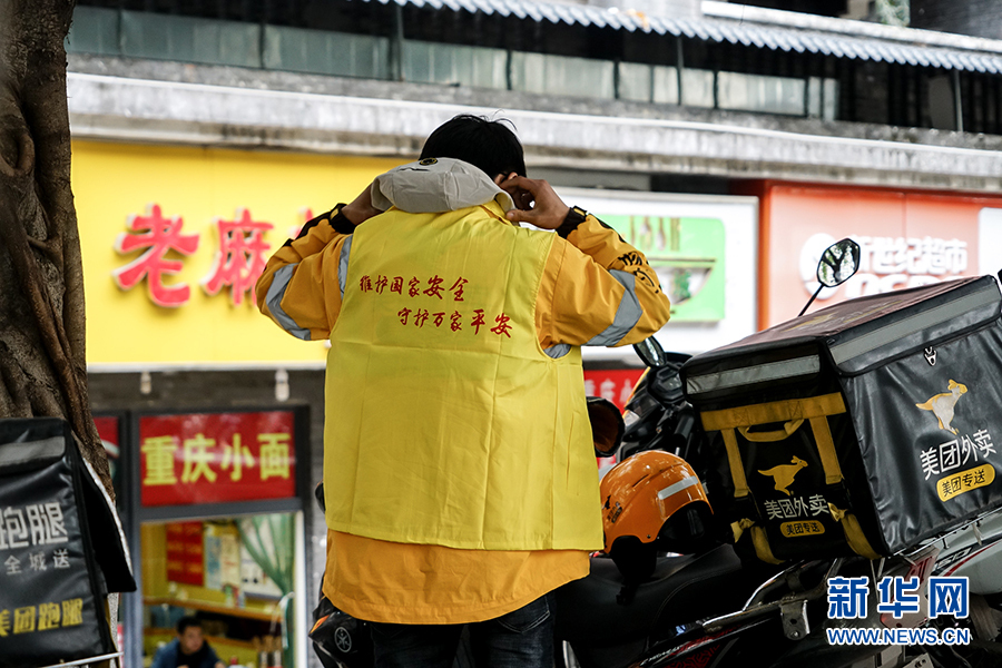 来到取餐的商家,王淞整理了一下印有国家安全宣传标语的背心。当天,重庆市沙坪坝区有200多名外卖骑手身着这款背心穿梭在大街小巷,化身国家安全宣传使者,把国家安全宣传品送到居民群众手里,让维护国家安全的宣传标语成为一道流动而醒目的风景线。新华网 韩梦霖 摄