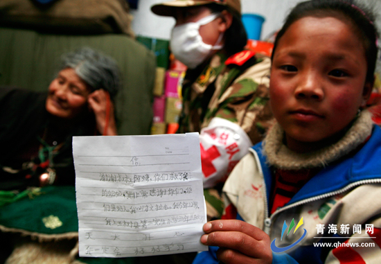 地震后,年仅12岁的才文拉毛给武警玉树支队官兵写感谢信。