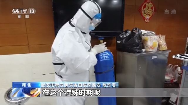 武汉市第四医院古田院区保安 陈珍贵:除了自己进行一些日常的工作之外,看到什么事情,我们就搭把手的事情,我们都把它给干了。包括什么送氧气啊,搬一些药水啊,包括那时候我们保洁少的时候,打扫卫生我们都做的。我们也不想说浪费一套防护服,那时候本身就很紧缺,我们进去把看到的能做的事情,一概都把它做完,能做的我们都做。
