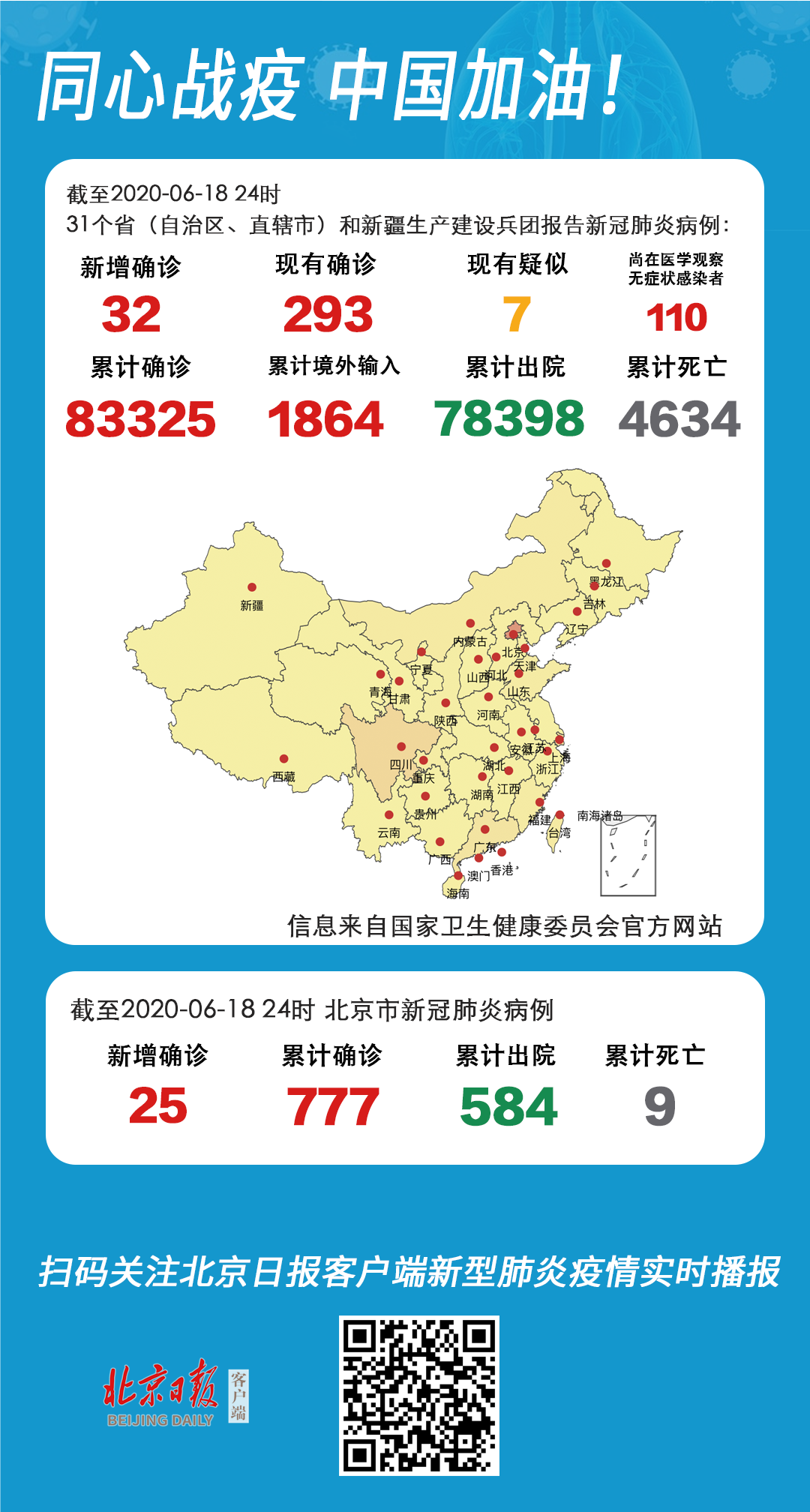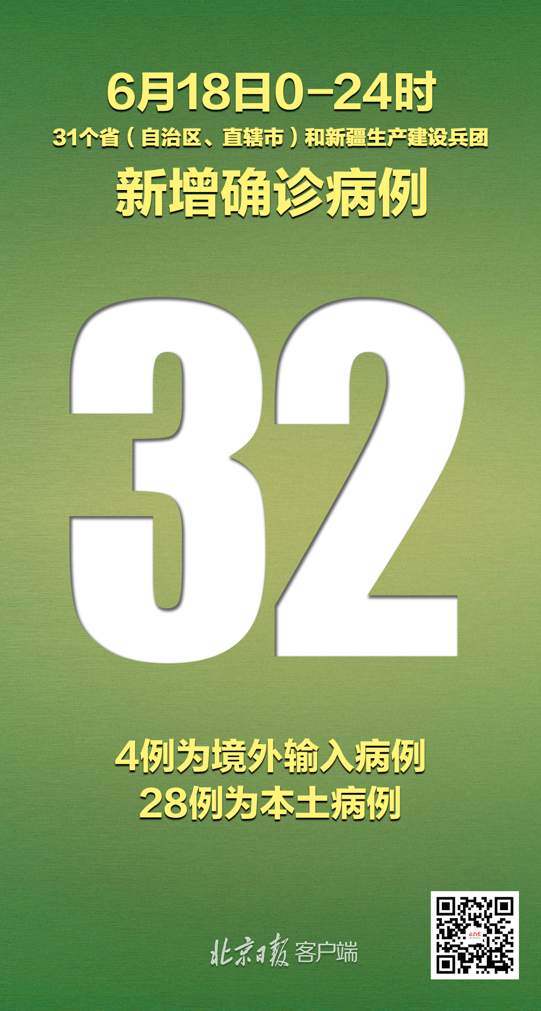 今天,国家卫生健康委员会公布了最新疫情数据,6月18日0—24时,31个省(自治区、直辖市)和新疆生产建设兵团报告新增确诊病例32例,其中境外输入病例4例(广东3例,甘肃1例),本土病例28例(北京25例,河北2例,辽宁1例);无新增死亡病例;新增疑似病例2例,均为本土病例(均在北京)。