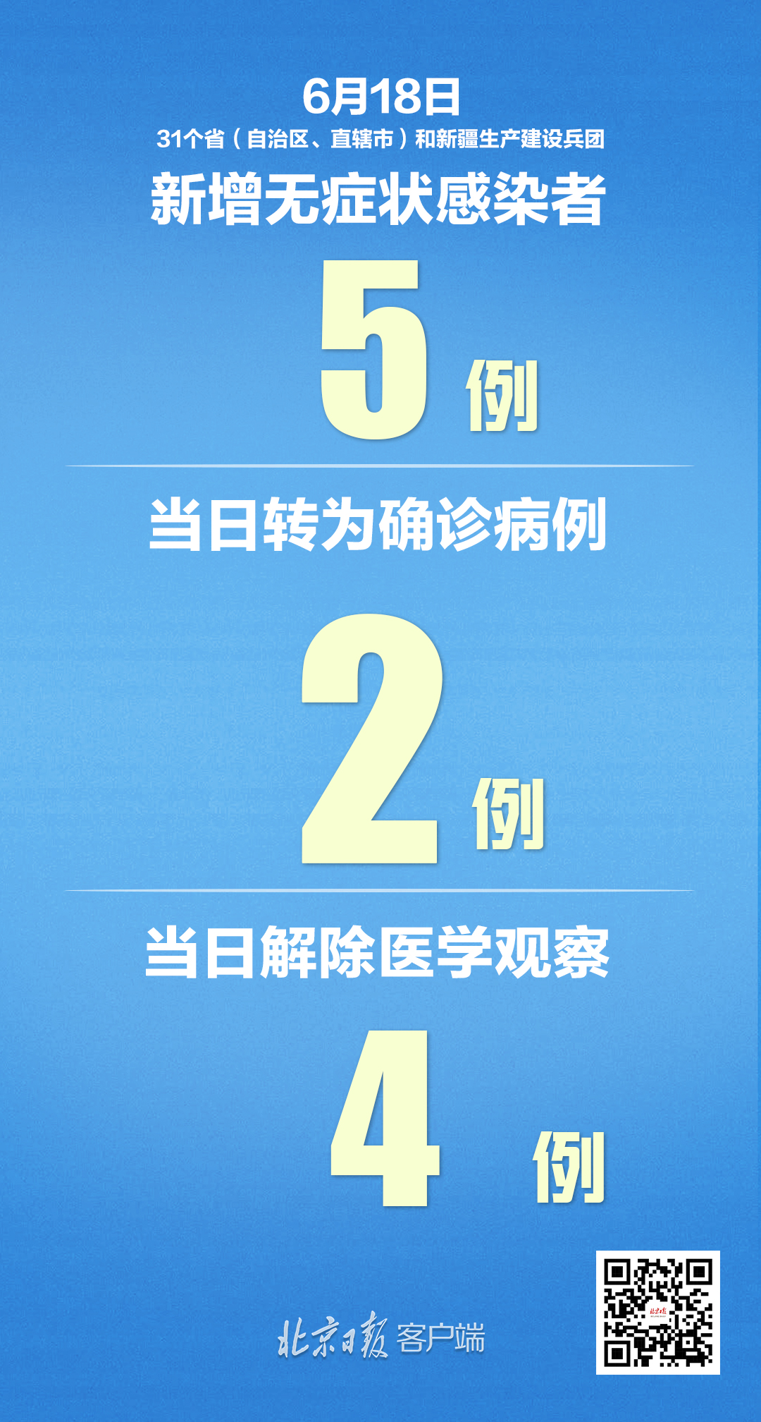 31个省(自治区、直辖市)和新疆生产建设兵团报告新增无症状感染者5例(无境外输入);当日转为确诊病例2例(无境外输入);当日解除医学观察4例(境外输入3例);尚在医学观察无症状感染者110例(境外输入60例)。