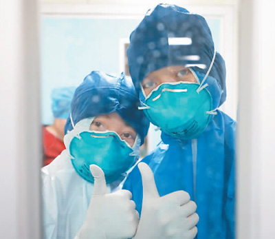 1月30日,支援武汉抗疫的海军军医大学医疗队重症监护室医护人员在工作间隙为自己鼓劲打气。