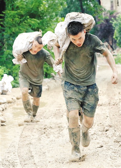 7月24日,第72集团军某合成旅官兵冒雨在安徽省肥西县三河镇张家圩装填沙袋,构筑堤坝,挡住洪水。