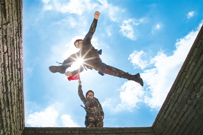 7月21日,武警广西总队预备特战队员在高温酷暑下进行跨越壕沟障碍训练。