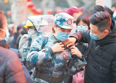 1月24日,空军军医大学医疗队受命紧急驰援武汉抗击新冠肺炎疫情,队员家属前来送行、帮助整理背囊。