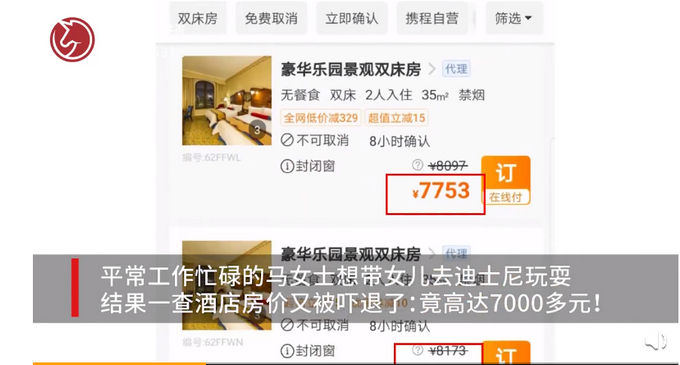 记者以10月2日入住、10月3日退房为例,于在线平台上查到的价格,的确显示入住一晚豪华乐园景观双床房的价格在7753元,高的甚至超过了8000元;而“官方直营”5479元的价格,已经被打上了“订完”的标签。这还是仅单房间,不含早餐的价格。而另一家乐园附近的玩具总动员酒店,在同一天的客房价格也飙至3156-3503元,显示“官方直营”的3171元价格同样已被订完。在迪士尼乐园酒店住一晚的成本要5400多元起步,再好一些的房型逼近6000元,甚至更高。
