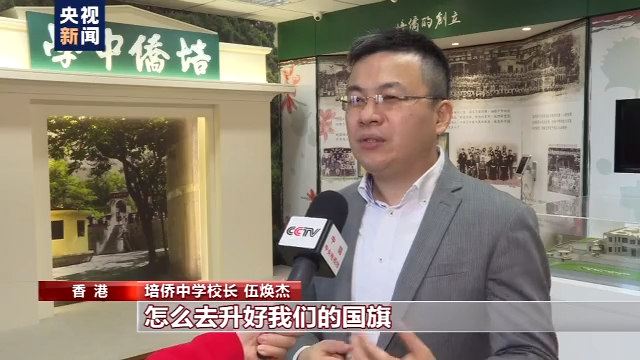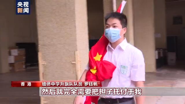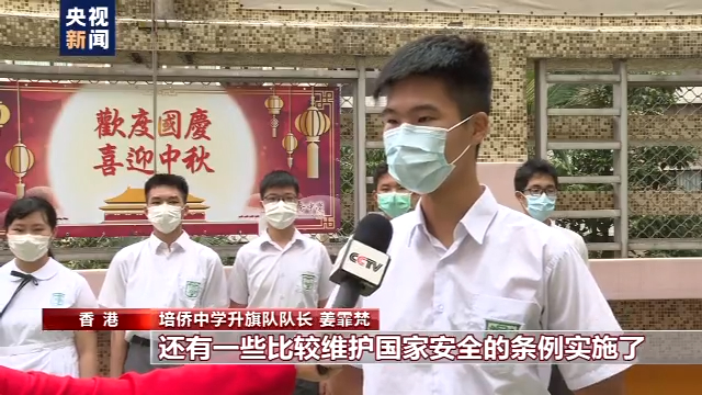 培侨中学升旗队队长 姜霏梵:国安法,还有一些比较维护国家安全的条例实施了,把香港的整个社会秩序给稳定下来,而且疫情也得到解散(控制)以后,这个是一个十分安定的时刻。我们也在这个时刻来进行一个升旗礼,在十一表达对我们祖国的一种依恋,还有一种敬意。
