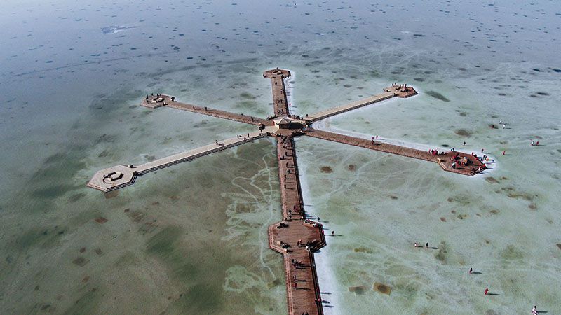 这是9月23日拍摄的茶卡盐湖“天空之镜”景区一角(无人机照片)。
