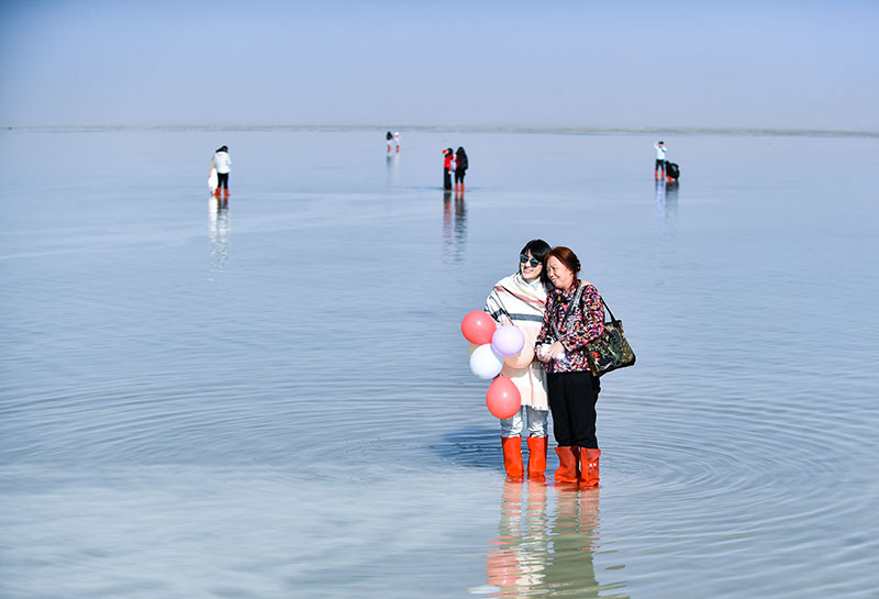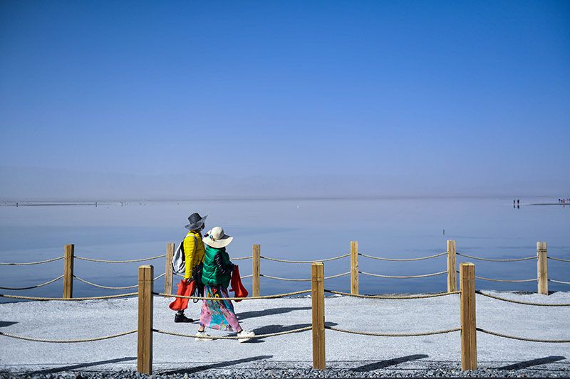 9月23日,游客在茶卡盐湖“天空之镜”景区游玩。