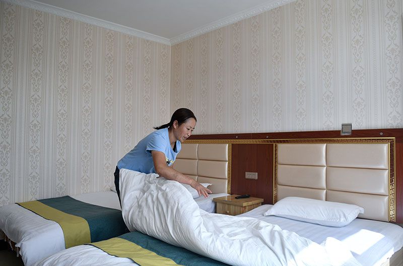 9月22日,在青海省海西蒙古族藏族自治州乌兰县茶卡镇巴音村,当地村民申得屏在自家经营的家庭宾馆内整理床铺。