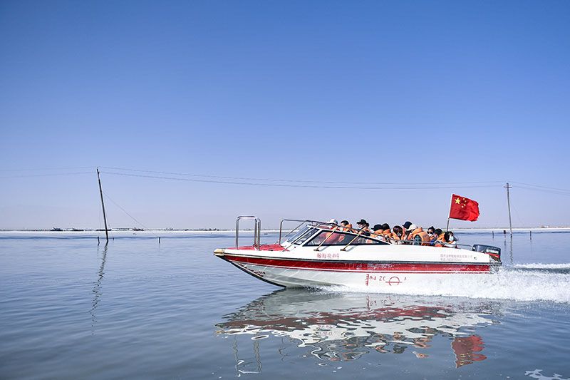 9月23日,游客在茶卡盐湖“天空之镜”景区乘坐快艇游玩。