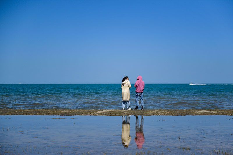 9月23日,游客在青海湖边游玩(无人机照片)。