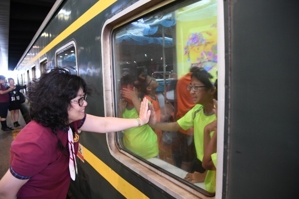 浴辉在手机上写出“明年还来”,隔着火车车窗让孩子们看。