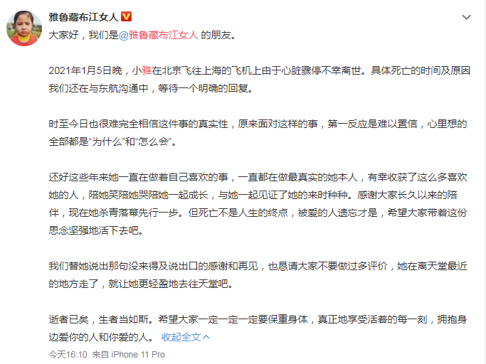 1月8日,时尚博主“雅鲁藏布江女人” 的朋友用其微博发文,透露2021年1月5日晚,小雅在北京飞往上海的飞机上由于心脏骤停不幸离世。具体死亡的时间及原因还在与东航沟通中,等待一个明确的回复。