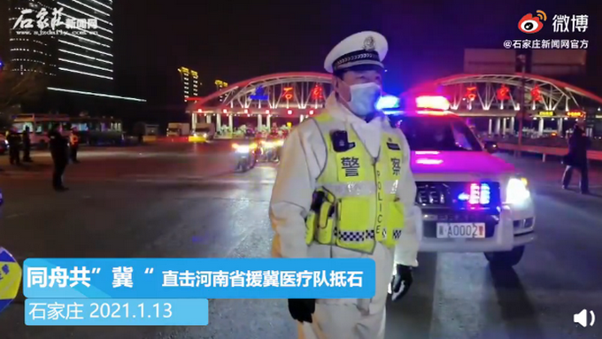 1月13日晚,河南省援冀医疗队抵达河北石家庄,支援抗疫工作。他们于1月13日16时30分从郑州市紧急医疗救援中心出发,21点40分抵达石家庄,将迅速开展工作。石家庄交警用最高礼遇迎接他们的到来。战胜疫情,我们在一起!