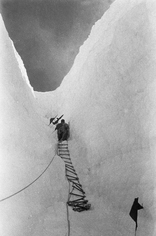 △登山队队员进入珠穆朗玛峰的“难关”——北坳,他们运用云梯在竖着的“冰胡同”挺进。