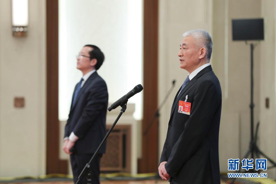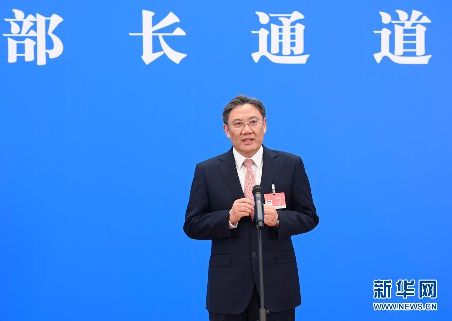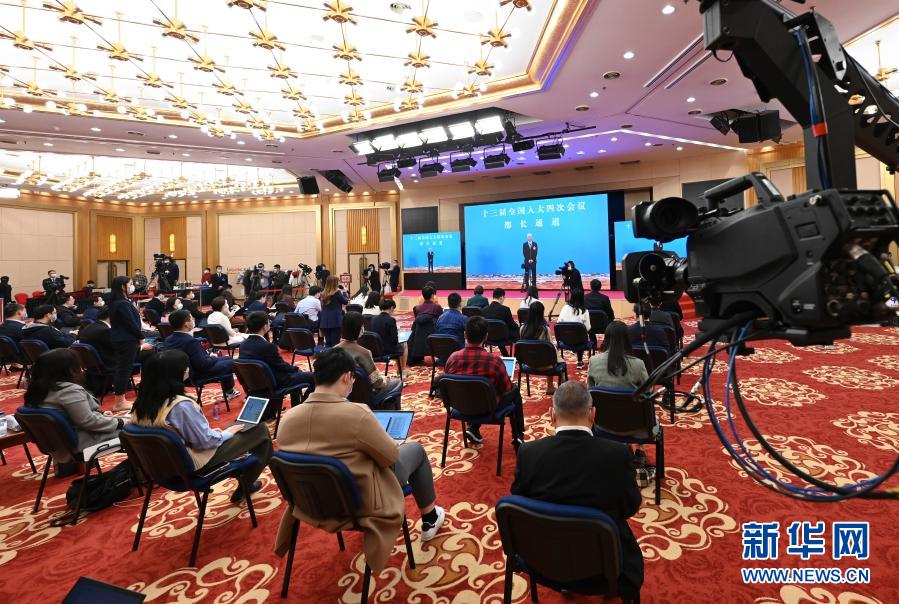 3月8日,第十三届全国人民代表大会第四次会议举行第二场“部长通道”采访活动。这是记者在分会场通过网络视频方式采访工业和信息化部部长肖亚庆。