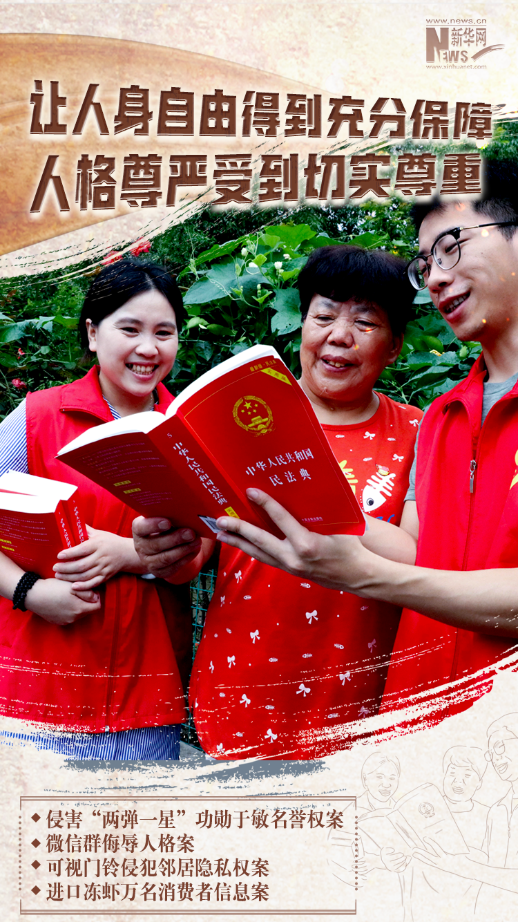 贯彻民法典,在司法政策中增加申请人格权侵害禁令等规定,畅通人格权救济渠道。审理侵害“两弹一星”功勋于敏名誉权案,决不让人民英雄受到玷污。审理微信群侮辱人格案,坚决制止网络暴力。审理职场性骚扰损害责任案,让性骚扰者受到法律制裁。审理可视门铃侵犯邻居隐私权案,明确安装监控不得侵扰他人生活安宁。审理进口冻虾万名消费者信息案,禁止滥用权利泄露公民个人信息。通过人格权案件的公正审理,让人身自由得到充分保障、人格尊严受到切实尊重,充分彰显我国民法典的人民立场和共和国人民的主体地位。