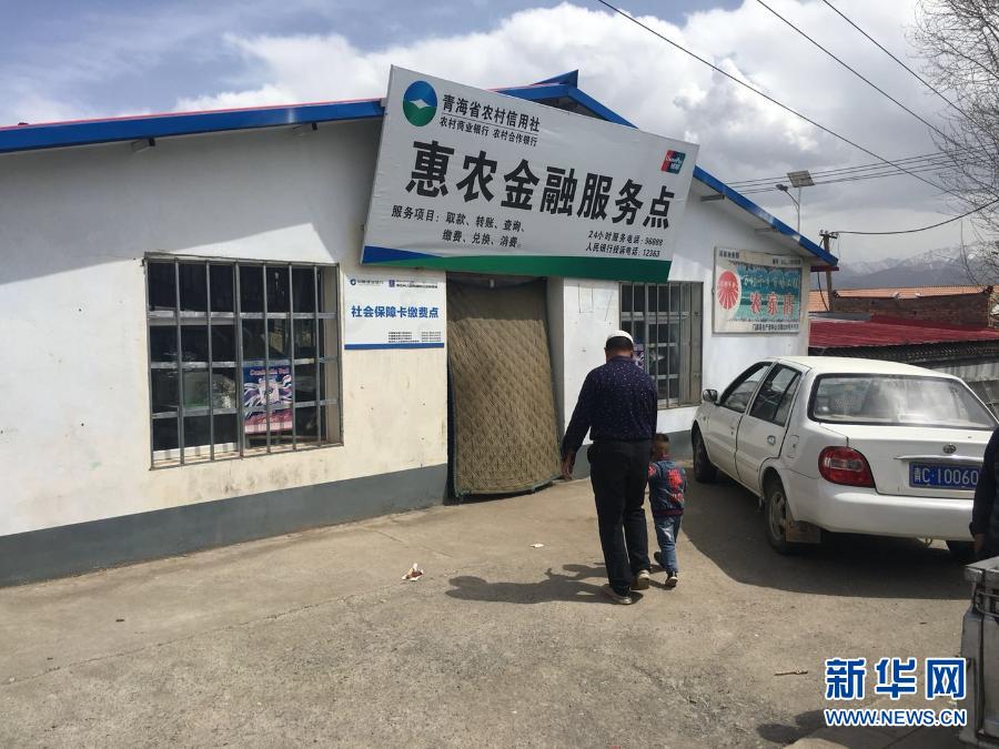 青海省海北藏族自治州门源回族自治县西沙河村村民前往该村的惠农金融服务点办理业务(2018年5月3日摄)。新华社记者 徐文婷 摄