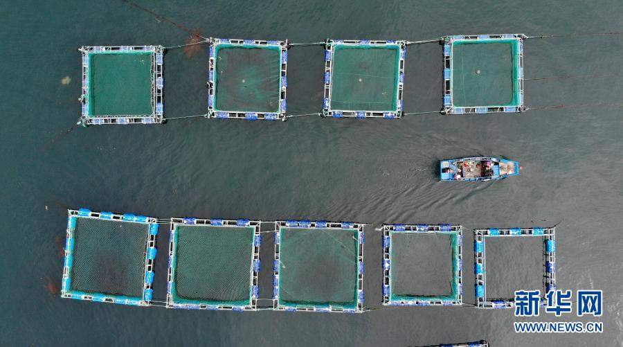 一艘渔船驶过山东省长岛综合试验区南隍城岛海上养殖区(2020年8月8日摄,无人机照片)。近年来,山东省长岛综合试验区南隍城岛在严守海洋生态红线的基础上,有序发展网箱养殖、立体生态养殖等特色海洋经济。 新华社记者 王凯 摄