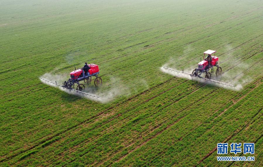 3月5日,河北省邢台市南和区阎里乡阎里村农民操作农业机械在麦田喷洒农药(无人机照片)。新华社记者 朱旭东 摄
