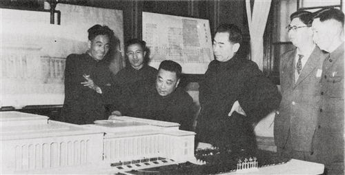 原北京市规划管理局设计院总建筑师张镈为周恩来总理讲解人民大会堂方案。