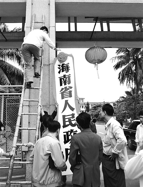 一九八八年四月二十五日,海南省委省政府揭牌的前一天,工作人员正在挂牌。黄一鸣摄