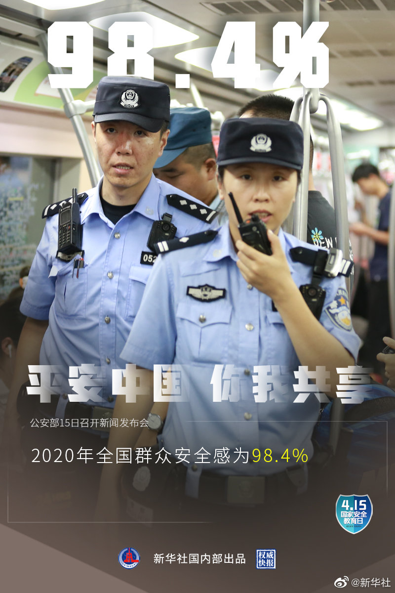 4月15日是第六个全民国家安全教育日,公安部15日召开新闻发布会介绍:2020年全国群众安全感为98.4%,全国居民对社会治安满意度达83.6%。截至2020年,全国刑事案件立案总量连续5年下降,八类主要刑事案件数和查处治安案件数连续6年下降。(记者熊丰,海报设计张晨光)