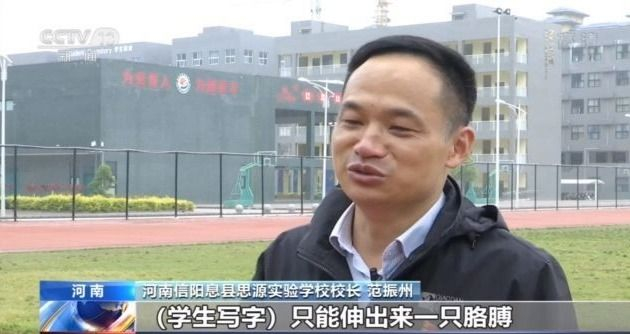 河南信阳息县思源实验学校校长 范振州:一个班里学生大概有100多人,坐在座位上两个胳膊互相打架,(学生写字)只能伸出来一只胳膊。