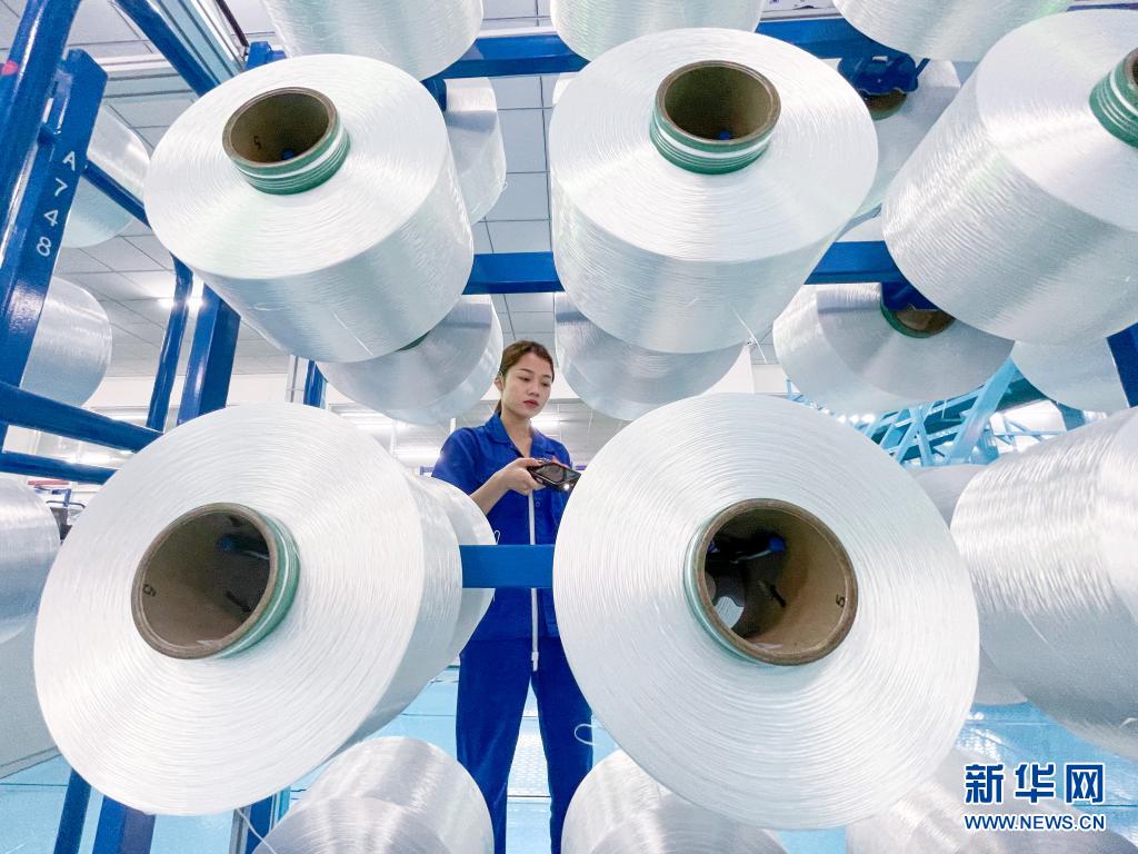 在位于江苏省苏州市吴江区的恒力化纤工业丝智能车间内,工作人员在通过二维码读取产品信息(2021年5月14日摄)。新华社记者 李博 摄