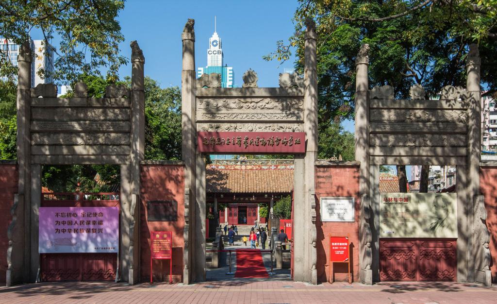 高楼林立间,坐落着一片典雅庄重的古建筑群,红墙黄瓦、殿檐斗拱、泮池拱桥……这便是位于广州越秀老城区的毛泽东同志主办农民运动讲习所旧址纪念馆。