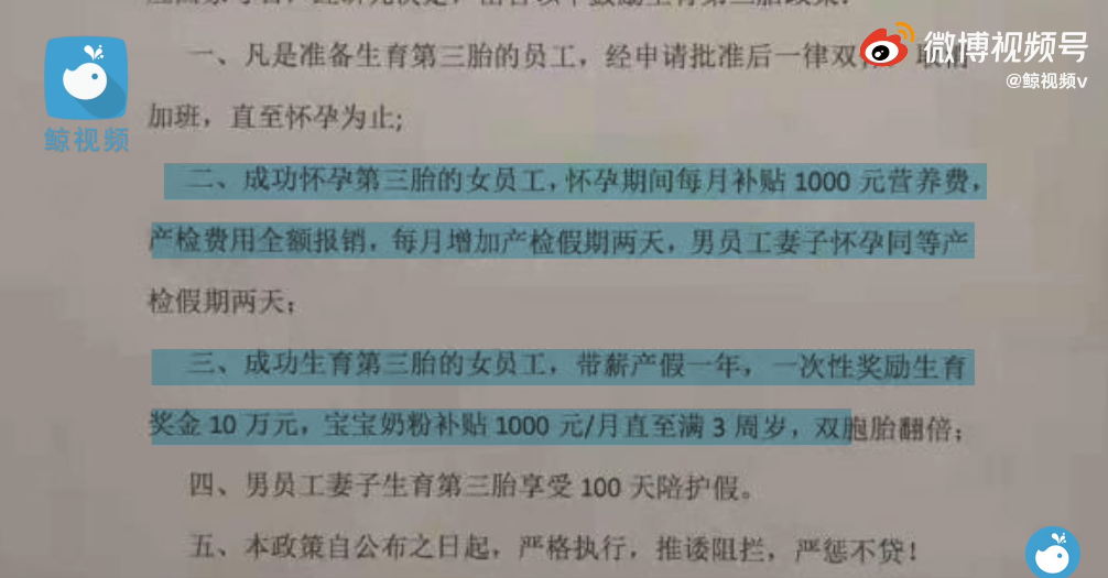 来源标题:青岛一公司女员工生三胎奖励10万元:法人称仅1位女员工,还补贴奶粉钱、营养费
