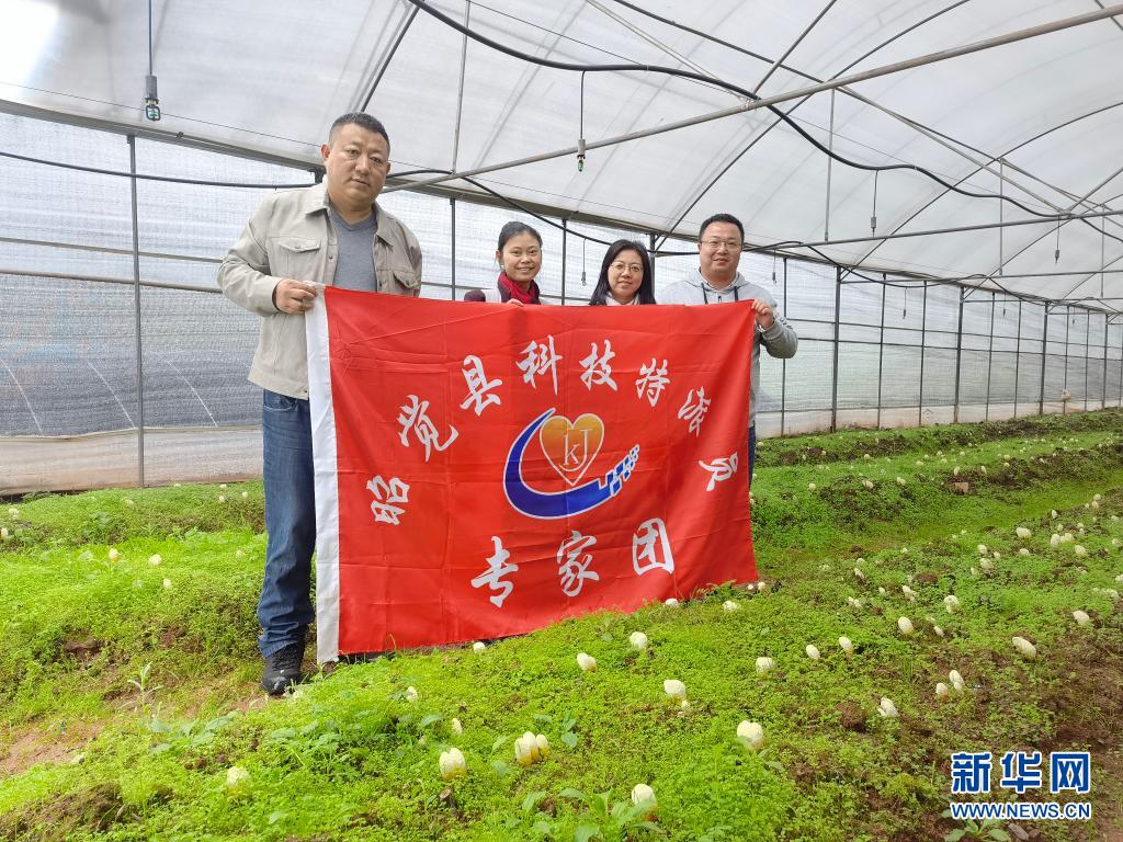 2020年6月3日,西南医科大学副教授夏纪毅(右一)与同事在四川凉山彝族自治州昭觉县火普村考察灵芝种植产业时合影。新华社发