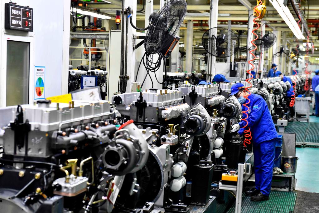 4月22日,在位于山东潍坊的潍柴集团总装车间,工人在流水线上装配发动机。(新华社记者郭绪雷摄)