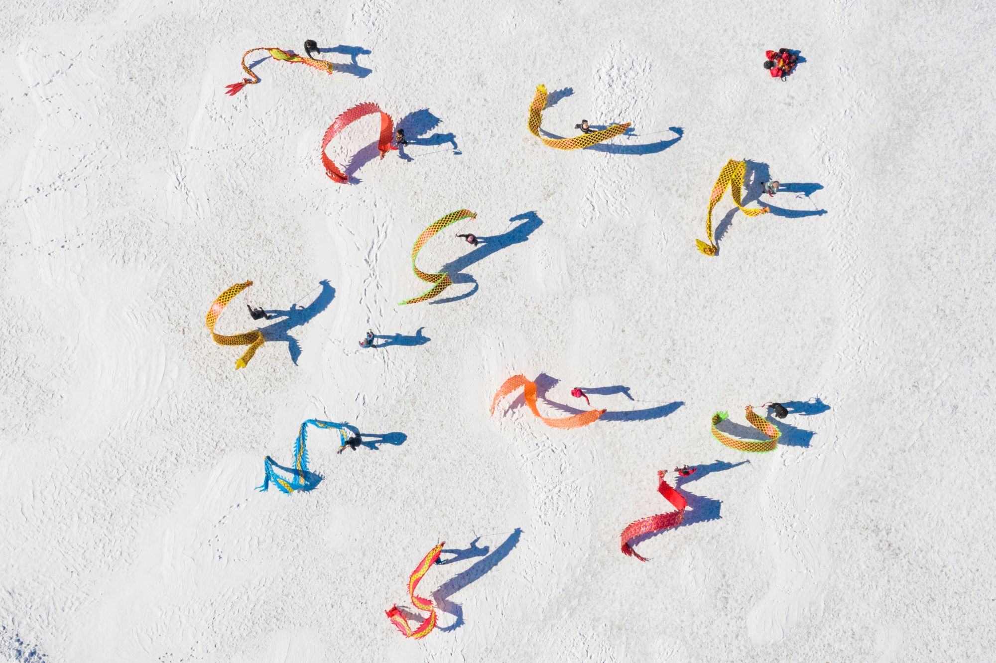 2021年3月6日,黑龙江省鹤岗市的健身爱好者们在新一体育公园内舞彩带龙。新华社记者谢剑飞摄