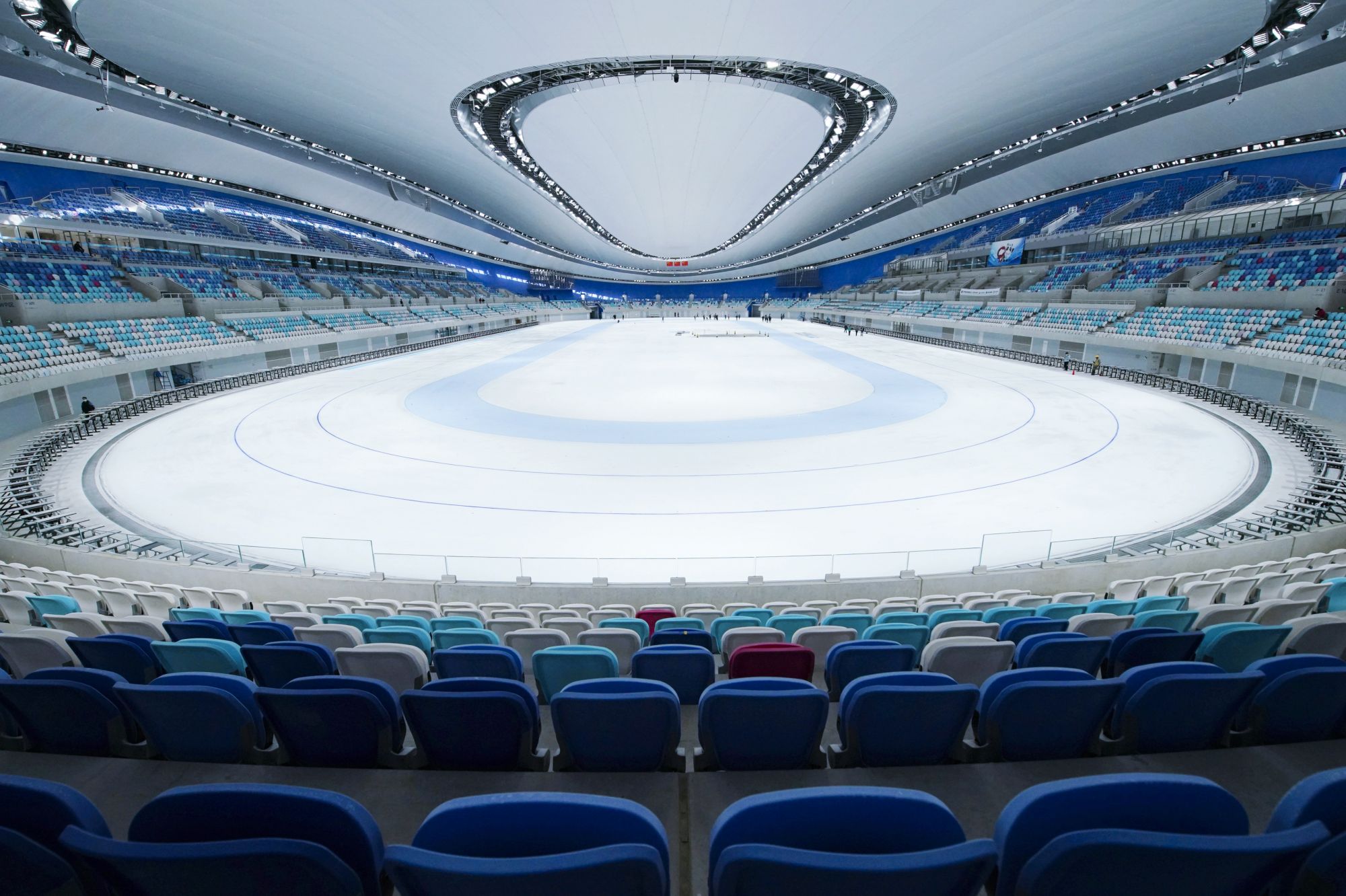 2021年5月8日,北京冬奥会标志性场馆国家速滑馆“冰丝带”开展首次全冰面制冰,规模约1.2万平方米的场馆全冰面成功亮相。新华社记者 张晨霖 摄