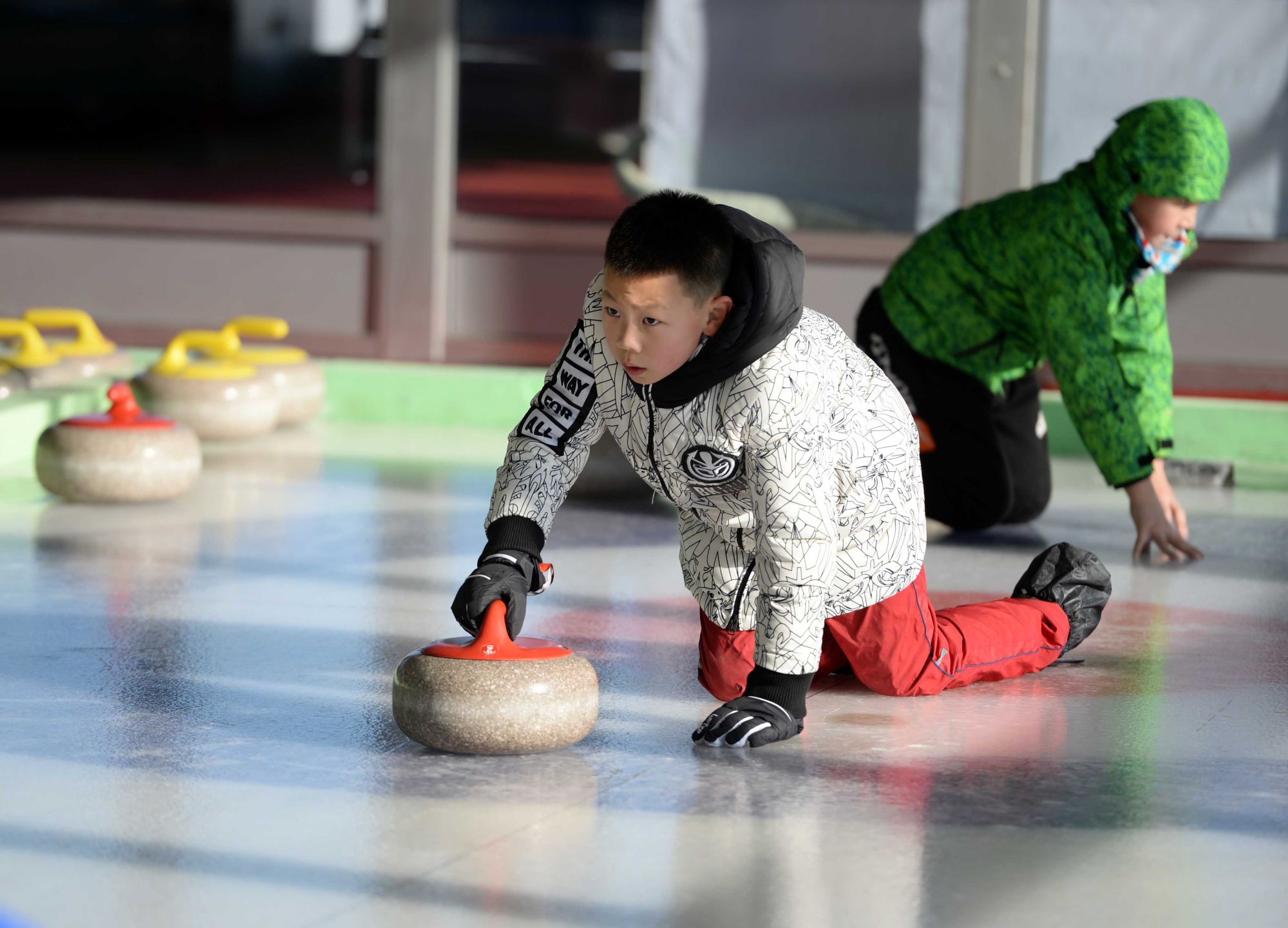 2017年1月9日,在黑龙江省冬季群众体育活动基地,一名小学生在学习掷冰壶。新华社记者王凯摄