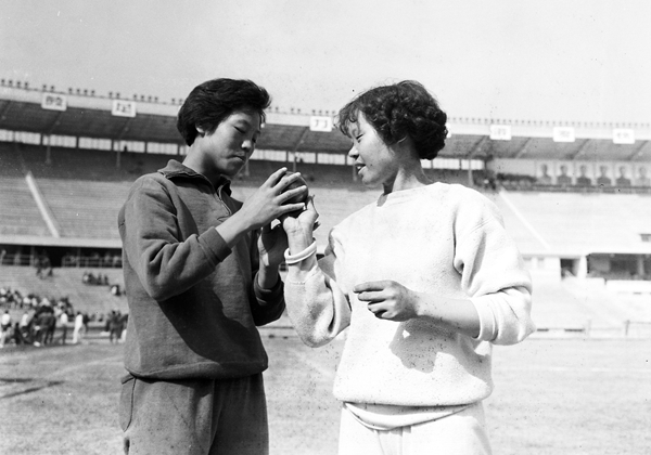 1959年,北京,在第一届全国运动会上,郑凤荣(左)和江苏省运动员毛阿宝。