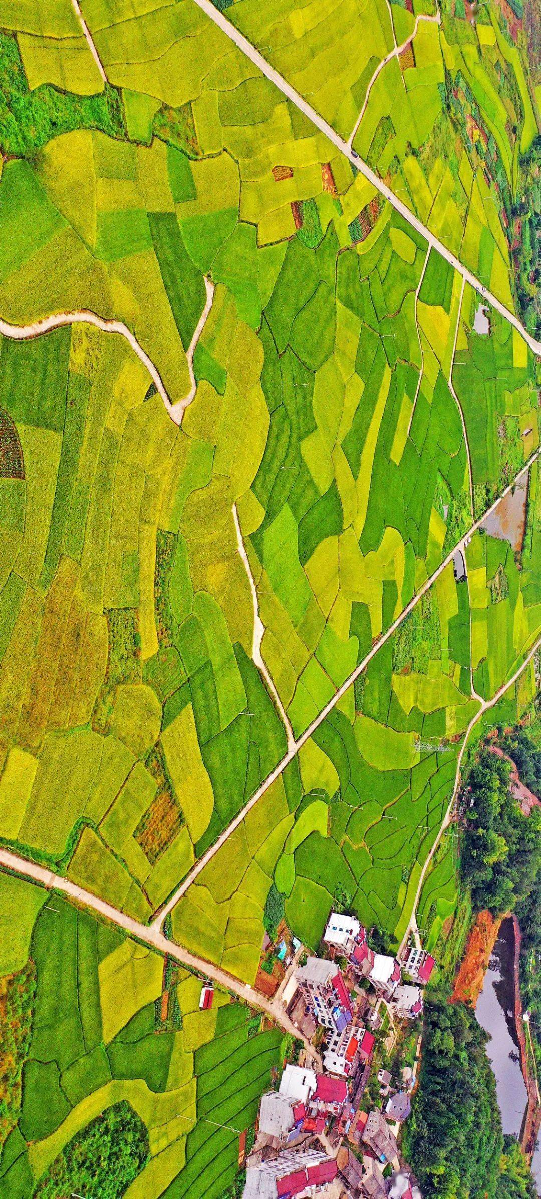 在浙江台州, 农田仿佛拼接而成的“地毯”,与村落、公路相映成趣。