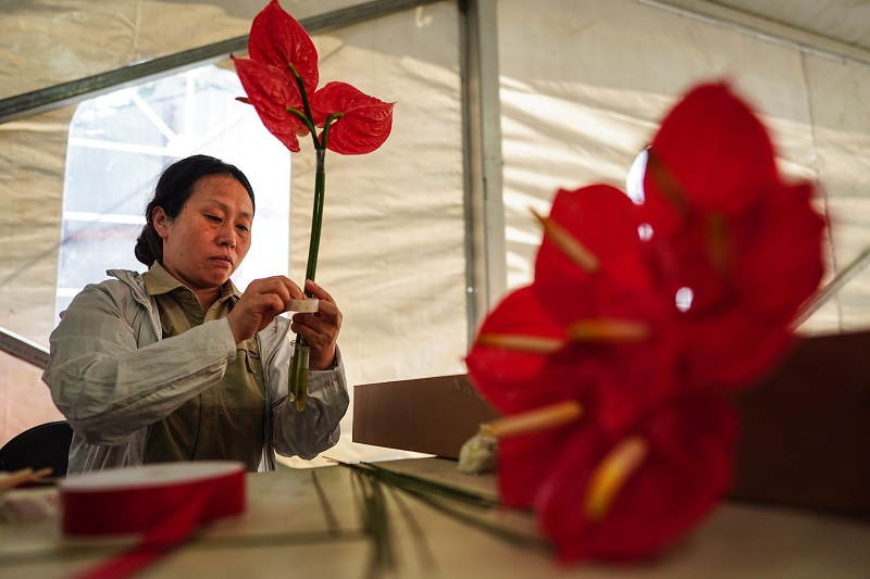 △工作人员对花篮进行修整,力求形态完美。