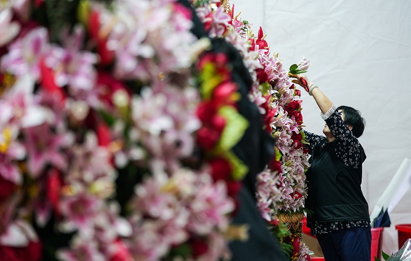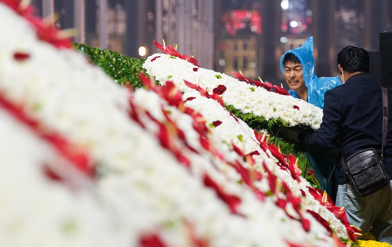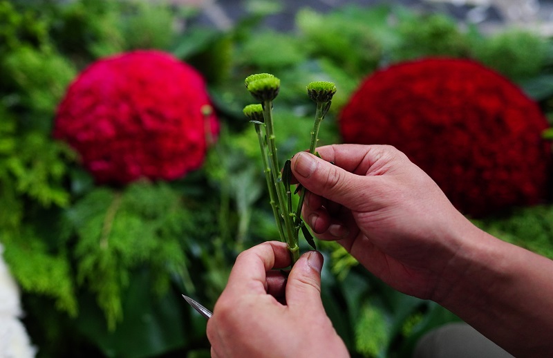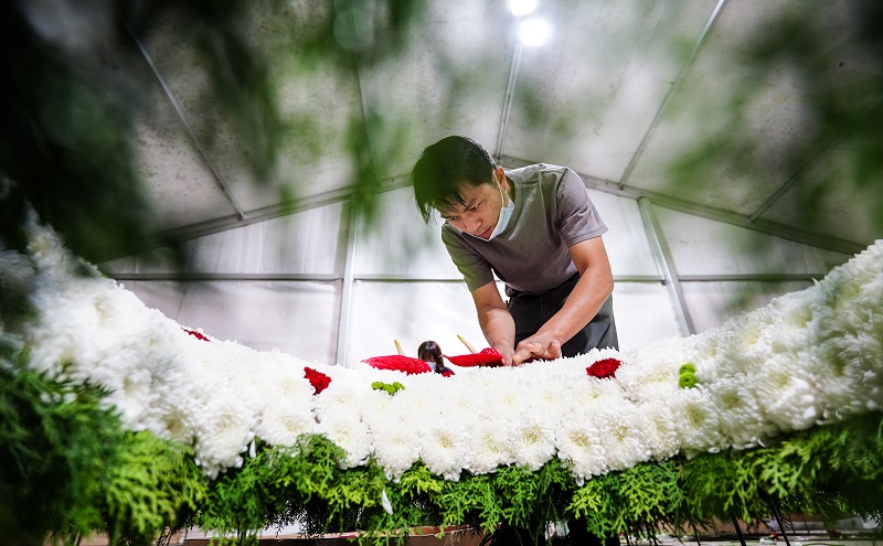 △花艺师为花台做最后的修整加工。万余朵新鲜白菊花扎制成的六座花台,要保证每一处线条与弧度整齐划一,这需要花艺师有丰富的经验。